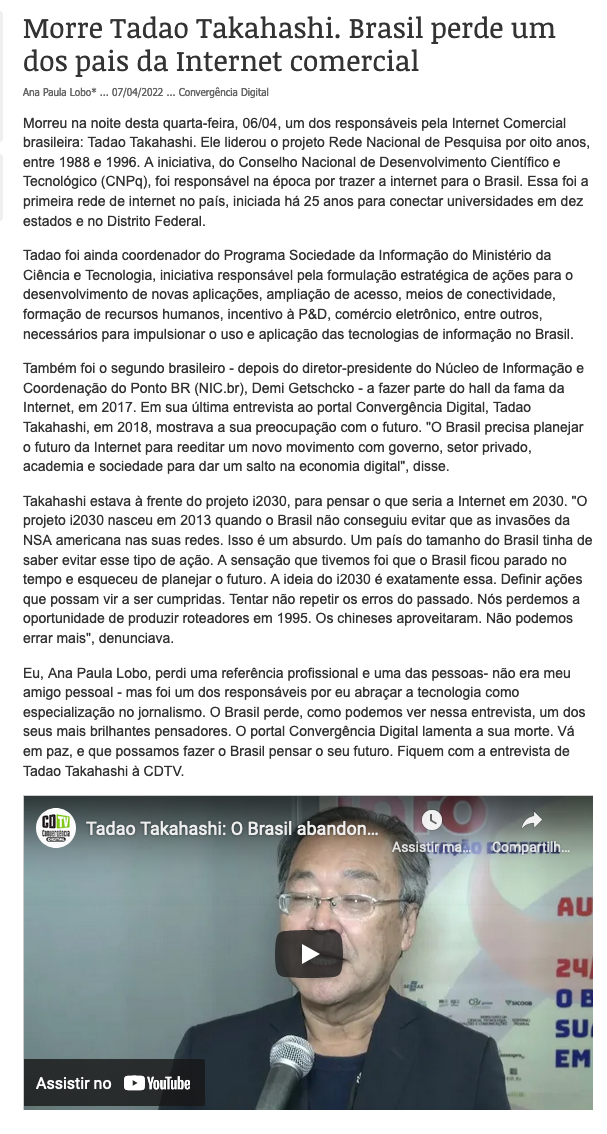 Eu, Ana Paula Lobo, perdi uma referência profissional e uma das pessoas- não era meu amigo pessoal - mas foi um dos responsáveis por eu abraçar a tecnologia como especialização no jornalismo. O Brasil perde, como podemos ver nessa entrevista, um dos seus mais brilhantes pensadores. O portal Convergência Digital lamenta a sua morte. Vá em paz, e que possamos fazer o Brasil pensar o seu futuro. Fiquem com a entrevista de Tadao Takahashi à CDTV.