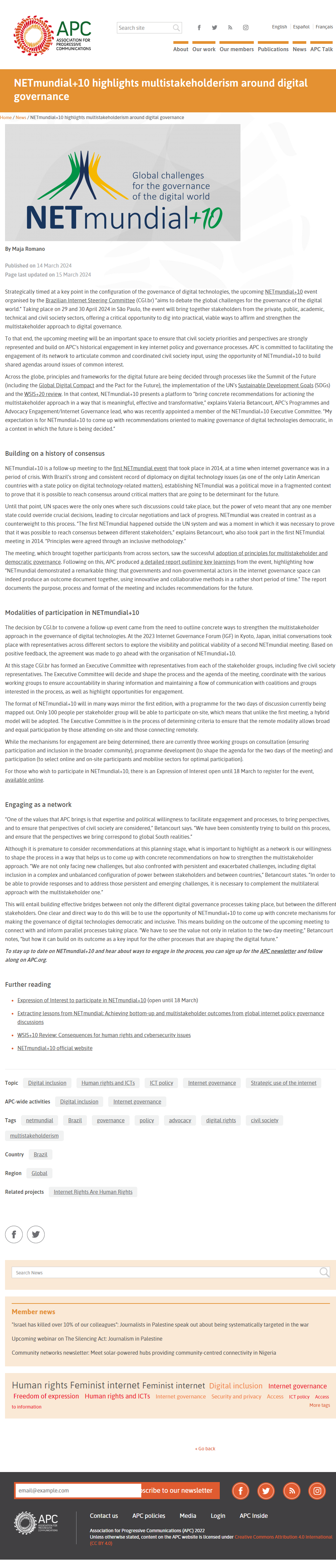 To stay up to date on NETmundial+10 and hear about ways to engage in the process, you can sign up for the APC newsletter and follow along on APC.org.