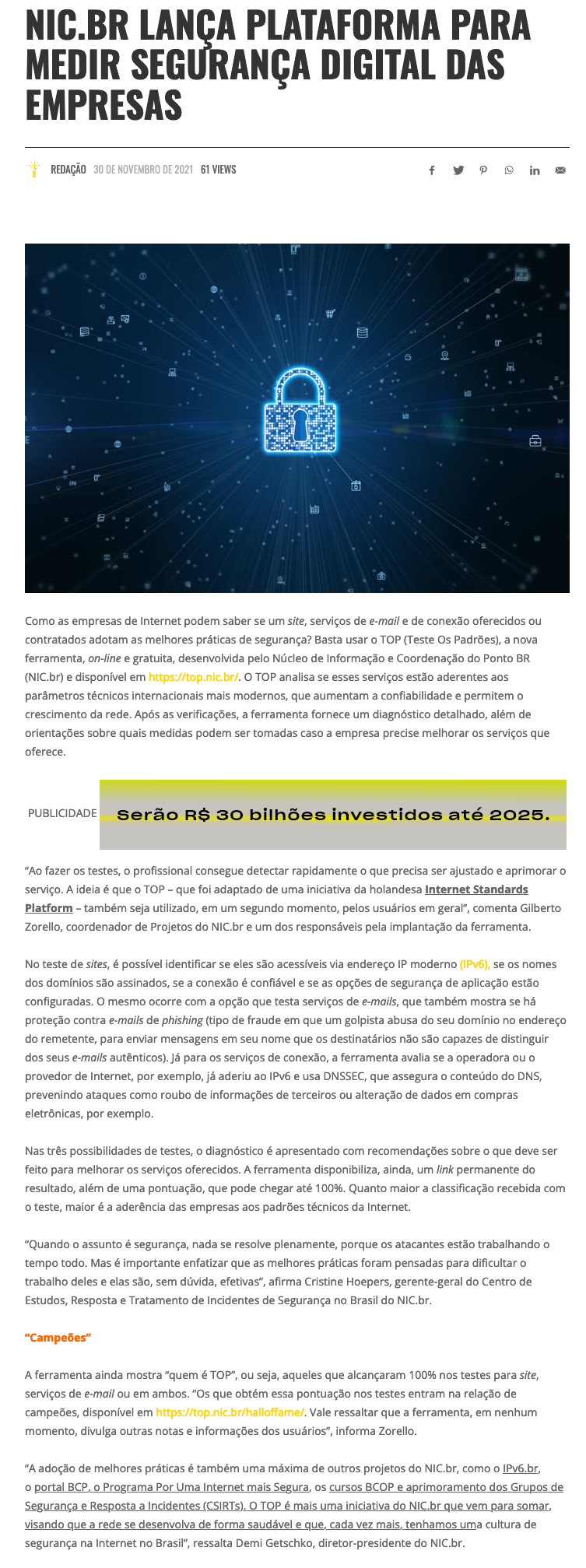 Como as empresas de Internet podem saber se um site, serviços de e-mail e de conexão oferecidos ou contratados adotam as melhores práticas de segurança? Basta usar o TOP (Teste Os Padrões), a nova ferramenta, on-line e gratuita, desenvolvida pelo Núcleo de Informação e Coordenação do Ponto BR (NIC.br) e disponível em https://top.nic.br/. O TOP analisa se esses serviços estão aderentes aos parâmetros técnicos internacionais mais modernos, que aumentam a confiabilidade e permitem o crescimento da rede. Após as verificações, a ferramenta fornece um diagnóstico detalhado, além de orientações sobre quais medidas podem ser tomadas caso a empresa precise melhorar os serviços que oferece.