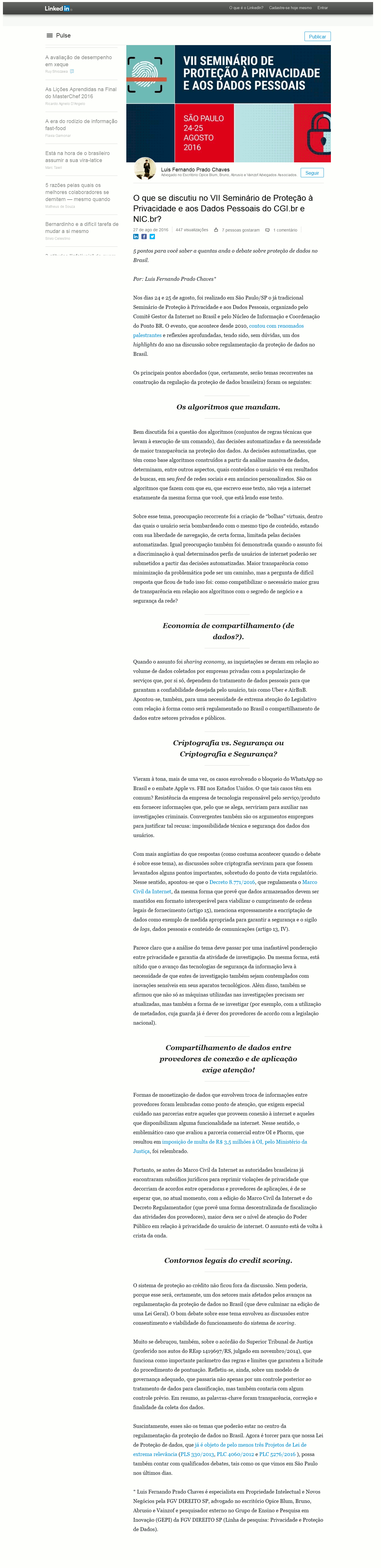 Suscintamente, esses são os temas que poderão estar no centro da regulamentação da proteção de dados no Brasil. Agora é torcer para que nossa Lei de Proteção de dados, que já é objeto de pelo menos três Projetos de Lei de extrema relevância (PLS 330/2013, PLC 4060/2012 e PLC 5276/2016 ), possa também contar com qualificados debates, tais como os que vimos em São Paulo nos últimos dias.