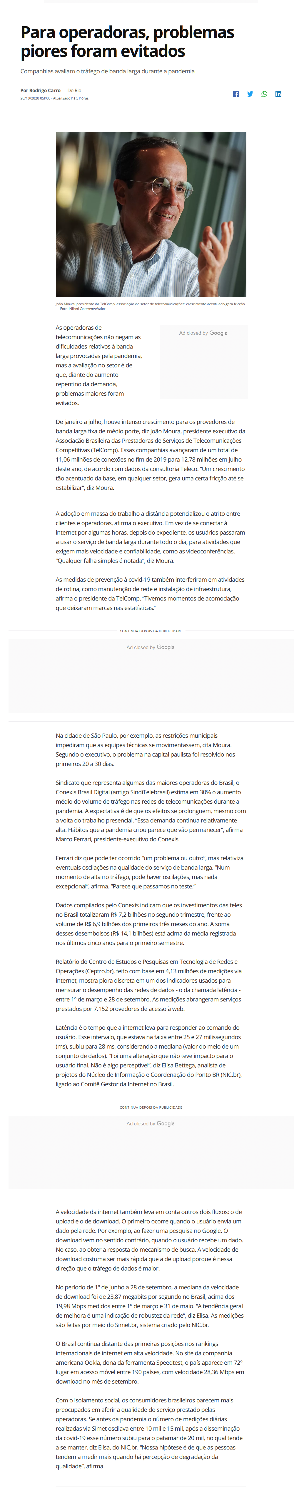 Ferrari diz que pode ter ocorrido “um problema ou outro”, mas relativiza eventuais oscilações na qualidade do serviço de banda larga. “Num momento de alta no tráfego, pode haver oscilações, mas nada excepcional”, afirma. “Parece que passamos no teste.”
