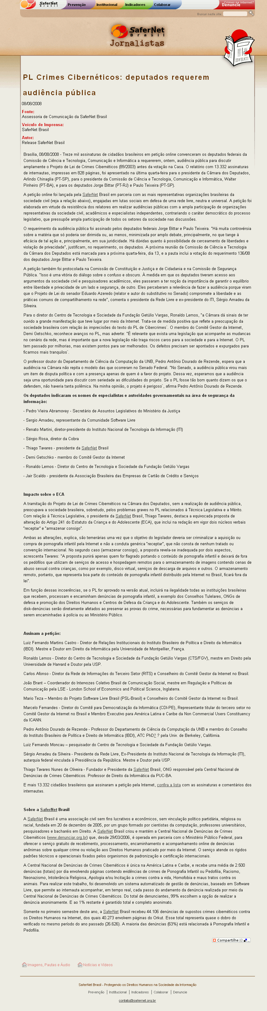 A tramitação do Projeto de Lei de Crimes Cibernéticos na Câmara dos Deputados, sem a realização de audiência pública, preocupava a sociedade brasileira, sobretudo, pelos problemas graves no PL relacionados à Técnica Legislativa e a Mérito. Com relação à Técnica Legislativa, o presidente da SaferNet Brasil, Thiago Tavares, destaca a equivocada proposta de alteração do Artigo 241 do Estatuto da Criança e do Adolescente (ECA), que inclui na redação em vigor dois núcleos verbais "receptar" e "armazenar consigo".Ambas as alterações, explica, são temerárias uma vez que o objetivo do legislador deveria ser criminalizar a aquisição ou compra de pornografia infantil pela Internet e não a conduta genérica "receptar", que não consta de nenhum tratado ou convenção internacional. No segundo caso (armazenar consigo), a proposta revela-se inadequada por dois aspectos, acrescenta Tavares: "A proposta punirá apenas quem for flagrado portando o conteúdo de pornografia infantil e deixará de fora os pedófilos que utilizam de serviços de acesso e hospedagem remotos para o armazenamento de imagens contendo cenas de abuso sexual contra crianças, como por exemplo, disco virtual, serviços de descarga de arquivos e outros. O armazenamento remoto, portanto, que representa boa parte do conteúdo de pornografia infantil distribuído pela Internet no Brasil, ficará fora da lei".