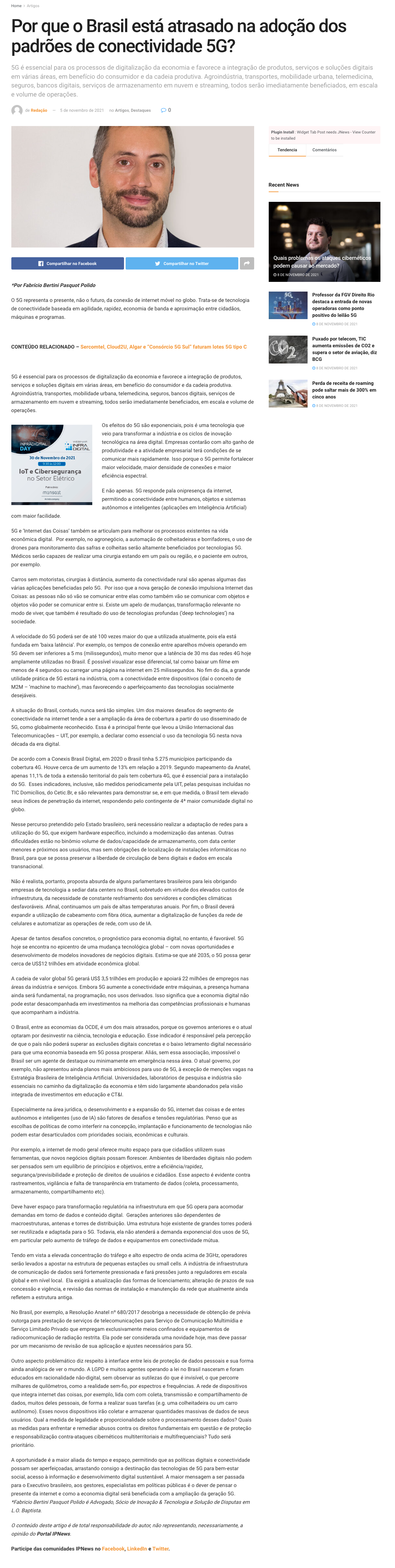 A oportunidade é a maior aliada do tempo e espaço, permitindo que as políticas digitais e conectividade possam ser aperfeiçoadas, arrastando consigo a destinação das tecnologias de 5G para bem-estar social, acesso à informação e desenvolvimento digital sustentável. A maior mensagem a ser passada para o Executivo brasileiro, aos gestores, especialistas em políticas públicas é o dever de pensar o presente da internet e como a economia digital será beneficiada com a ampliação da geração 5G. *Fabricio Bertini Pasquot Polido é Advogado, Sócio de Inovação & Tecnologia e Solução de Disputas em L.O. Baptista.