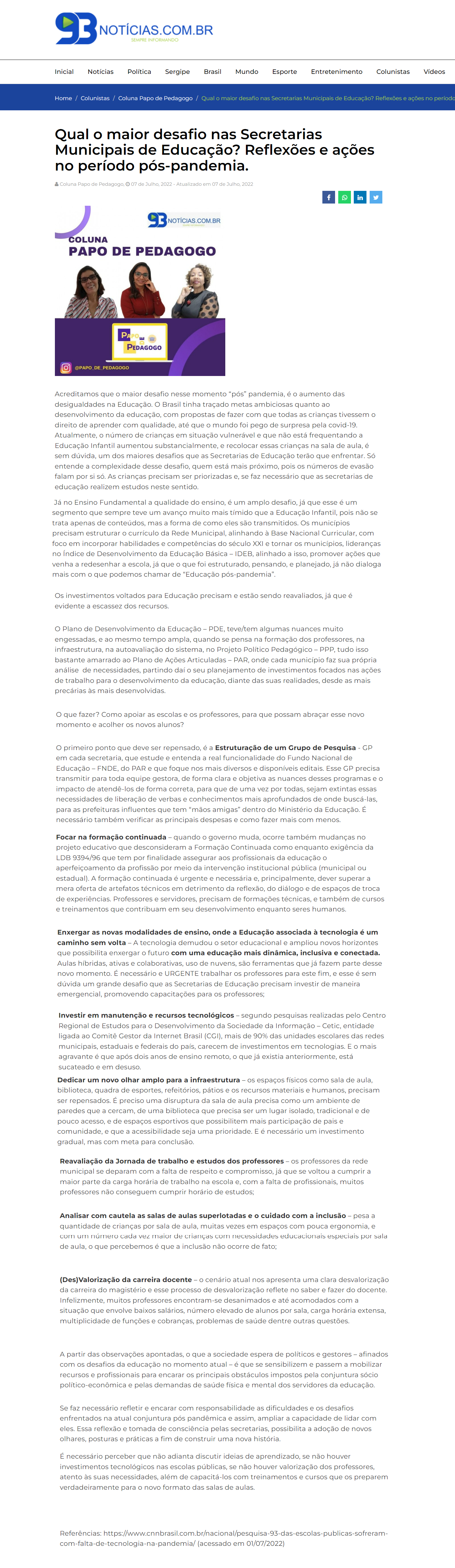 Se faz necessário refletir e encarar com responsabilidade as dificuldades e os desafios enfrentados na atual conjuntura pós pandêmica e assim, ampliar a capacidade de lidar com eles. Essa reflexão e tomada de consciência pelas secretarias, possibilita a adoção de novos olhares, posturas e práticas a fim de construir uma nova história.