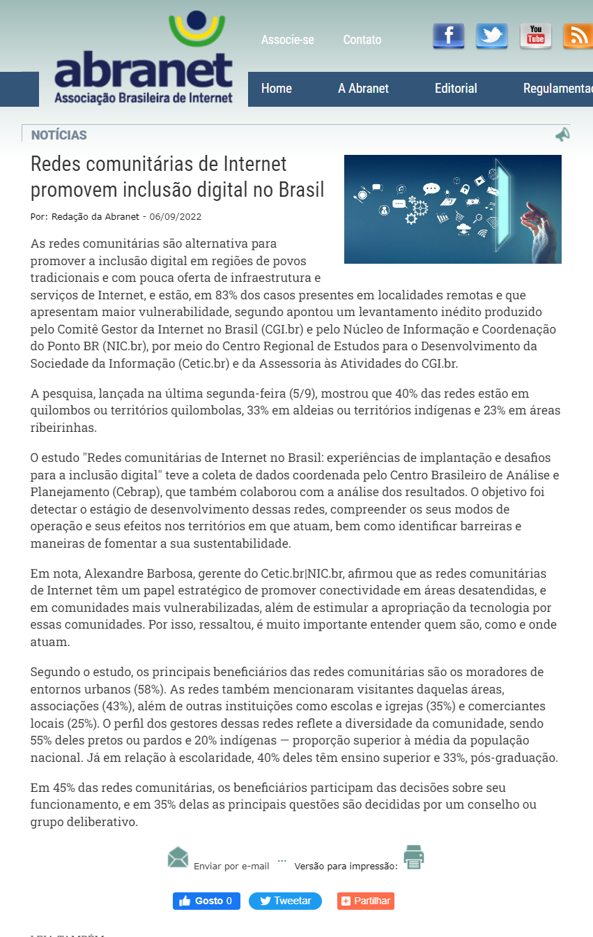 Em nota, Alexandre Barbosa, gerente do Cetic.br|NIC.br, afirmou que as redes comunitárias de Internet têm um papel estratégico de promover conectividade em áreas desatendidas, e em comunidades mais vulnerabilizadas, além de estimular a apropriação da tecnologia por essas comunidades. Por isso, ressaltou, é muito importante entender quem são, como e onde atuam.