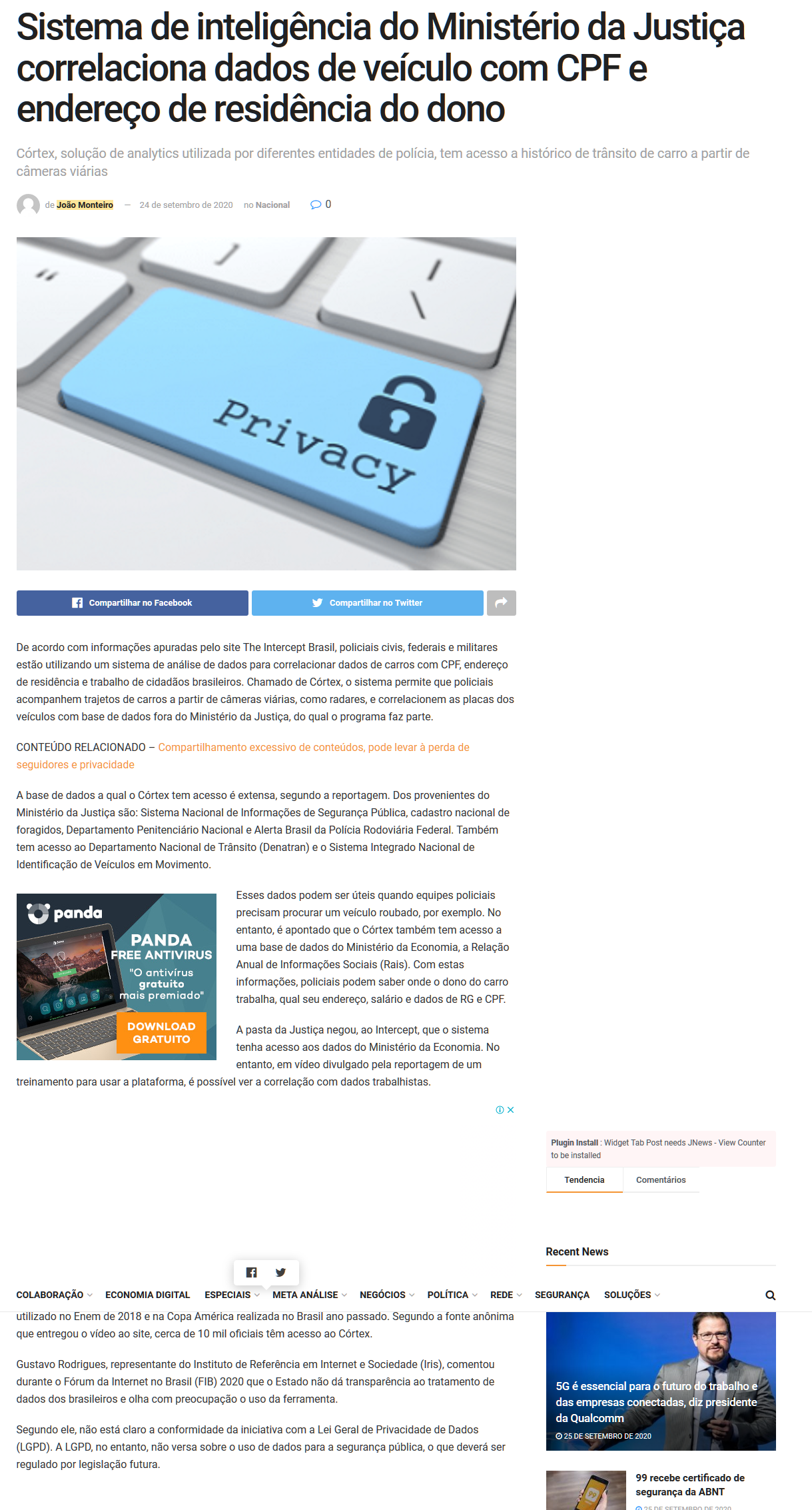 De acordo com informações apuradas pelo site The Intercept Brasil, policiais civis, federais e militares estão utilizando um sistema de análise de dados para correlacionar dados de carros com CPF, endereço de residência e trabalho de cidadãos brasileiros. Chamado de Córtex, o sistema permite que policiais acompanhem trajetos de carros a partir de câmeras viárias, como radares, e correlacionem as placas dos veículos com base de dados fora do Ministério da Justiça, do qual o programa faz parte.