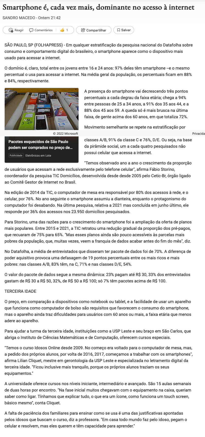 Em qualquer estratificação da pesquisa nacional do Datafolha sobre consumo e comportamento digital do brasileiro, o smartphone aparece como o dispositivo mais usado para acessar a internet.