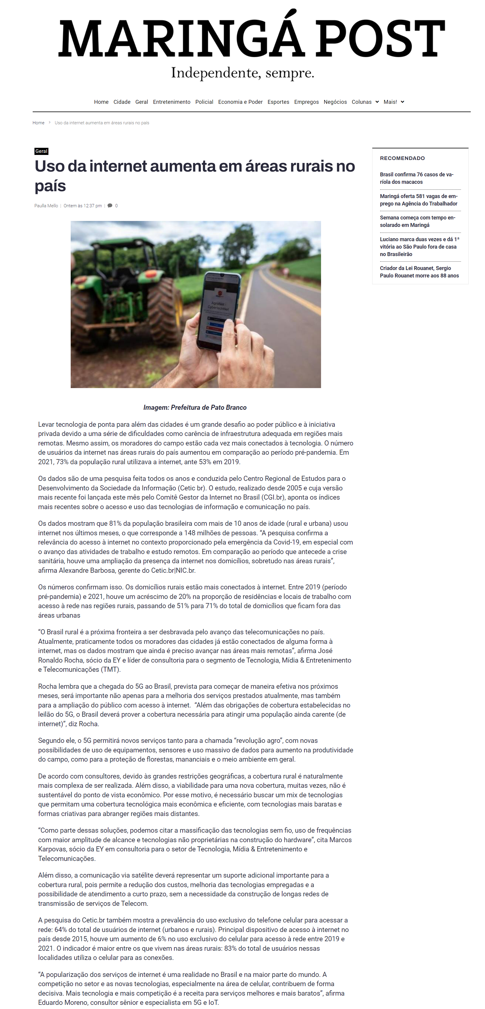 Os números confirmam isso. Os domicílios rurais estão mais conectados à Internet. Entre 2019 (período pré-pandemia) e 2021, houve um acréscimo de 20% na proporção de residências e locais de trabalho com acesso à rede nas regiões rurais, passando de 51% para 71% do total de domicílios que ficam fora das áreas urbanas
